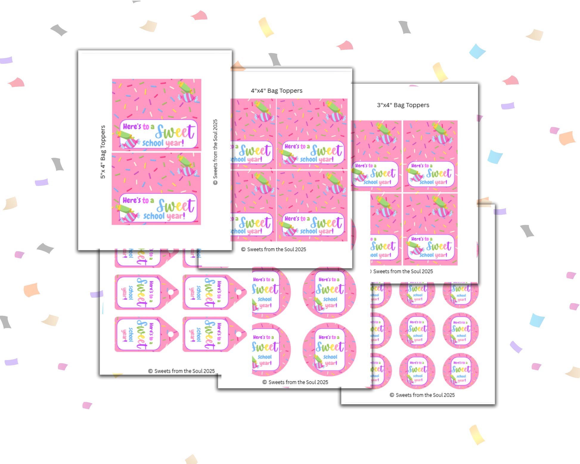 Includes: Bag Toppers in 5", 4", and 3" width, 2" x 3.5" Gift Tags when printed on card stock and 2" and 3" Round Stickers when printed on sticker paper.