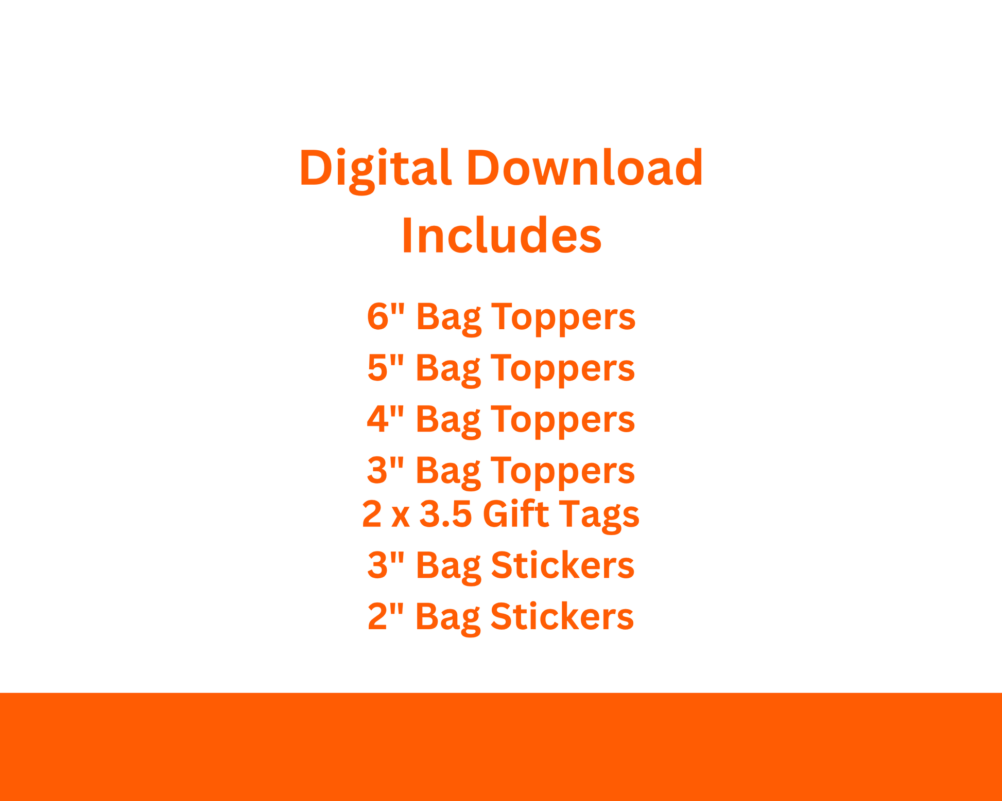 Includes: Bag Toppers in 6", 5", 4", and 3" width, 2" x 3.5" Gift Tags when printed on card stock and 2" and 3" Round Stickers when printed on sticker paper.
